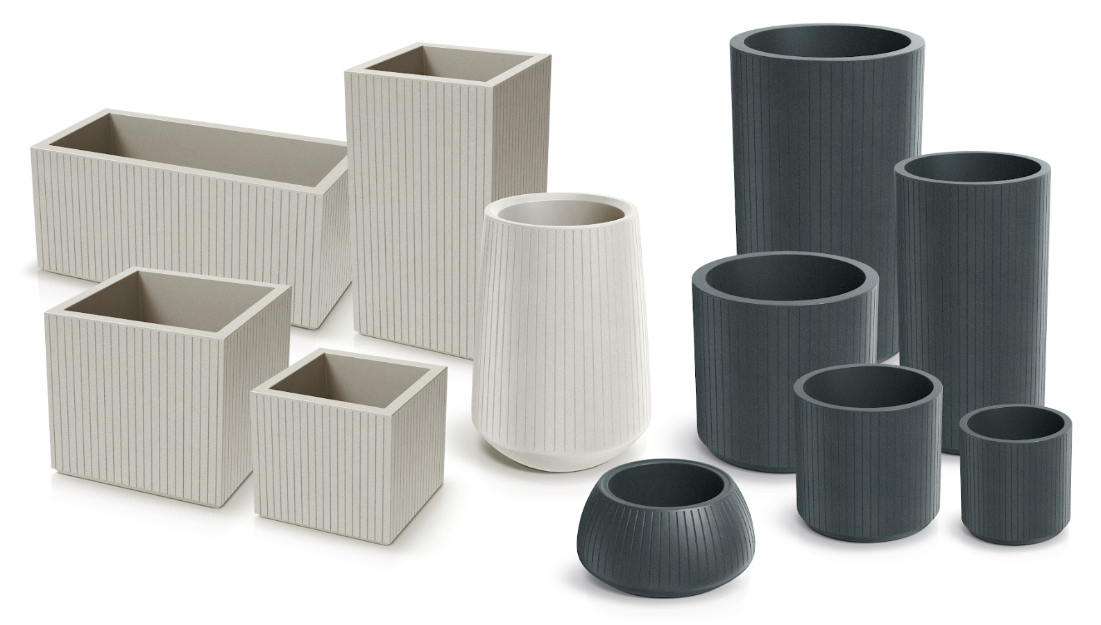 Seria obejmuje różnorodne kształty – od cylindrycznych po prostokątne – oraz wiele wysokości i rozmiarów, dzięki czemu można tworzyć efektowne aranżacje zieleni w różnych przestrzeniach. Zestawienie kilku modeli obok siebie pozwala uzyskać ciekawy, dynamiczny efekt dekoracyjny.