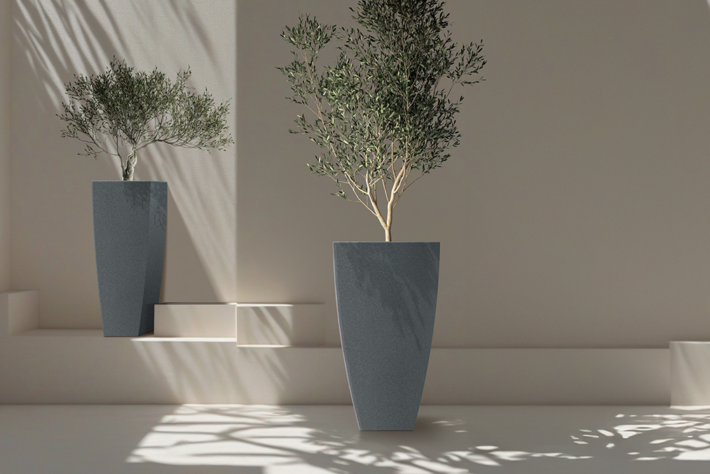 Seria dostępna jest w różnych rozmiarach i dwóch stylowych odcieniach szarości, co pozwala tworzyć spójne aranżacje roślinne w wielu miejscach – od salonów i balkonów po restauracje, hotele i inne przestrzenie komercyjne.
