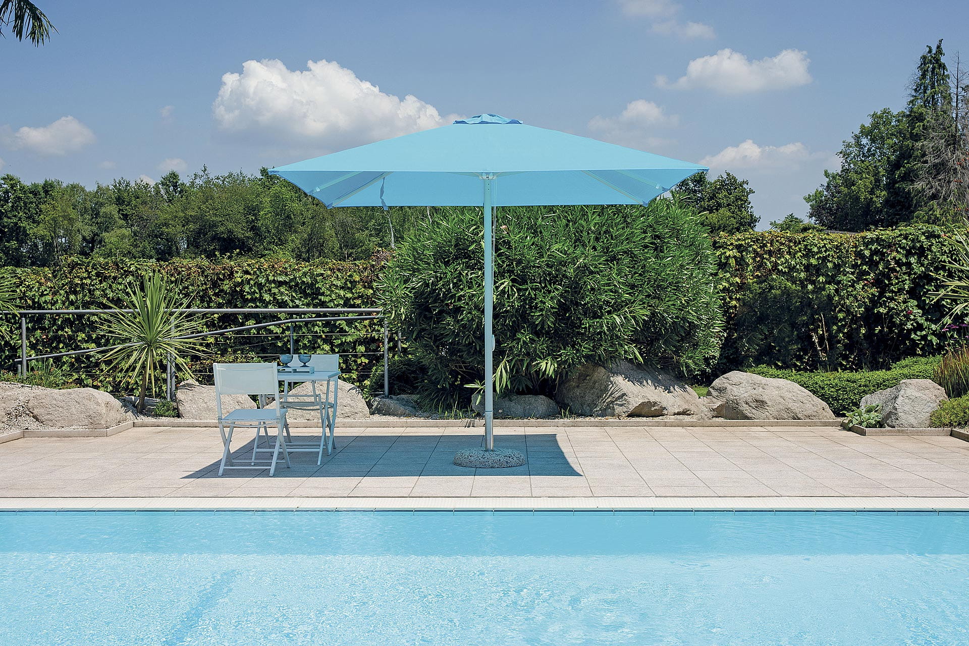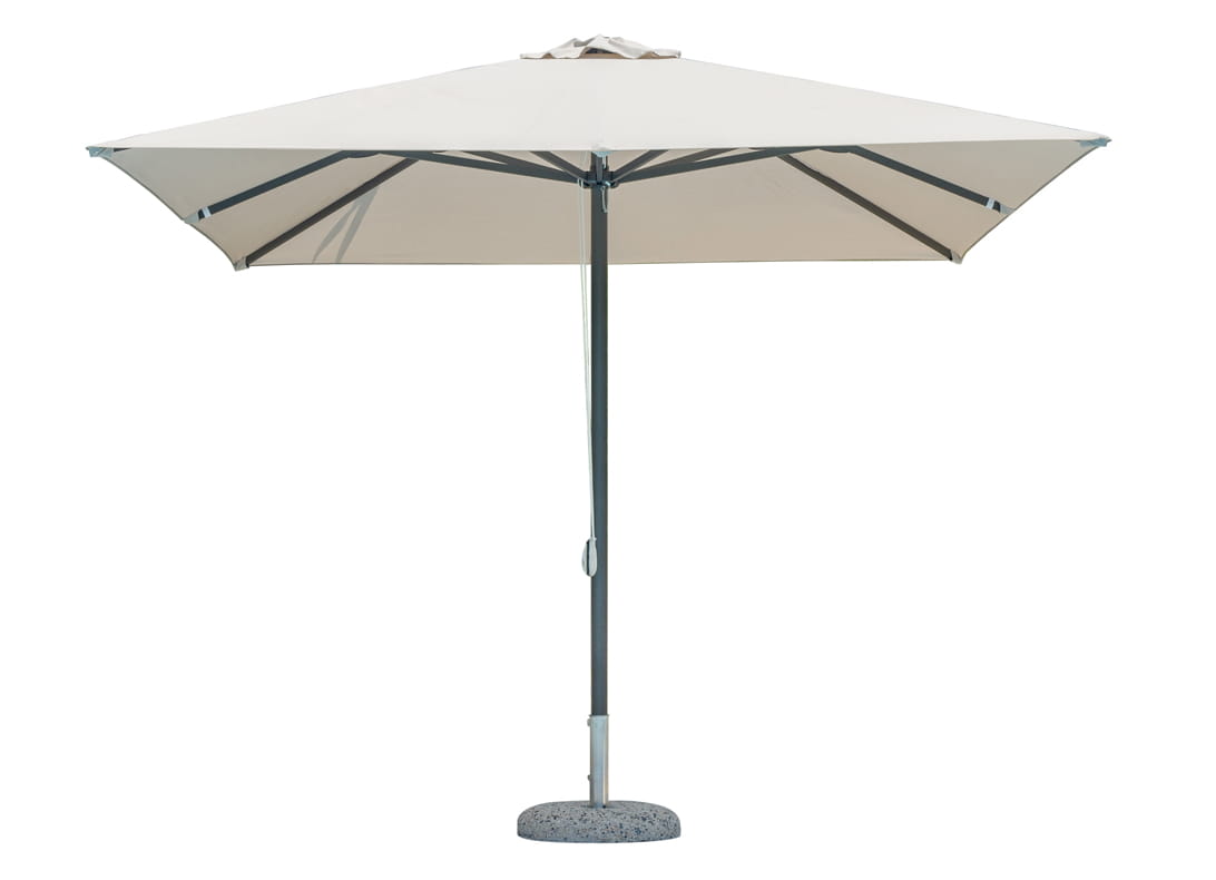 Mechanizm podwójnej ręcznej bloczki z blokadą umożliwia łatwe i bezpieczne otwieranie parasola, zapewniając pełną kontrolę nad jego ustawieniem. Dzięki maksymalnej wysokości 2,80 m parasol skutecznie chroni przed słońcem, oferując komfortowy cień w każdej strefie wypoczynkowej.