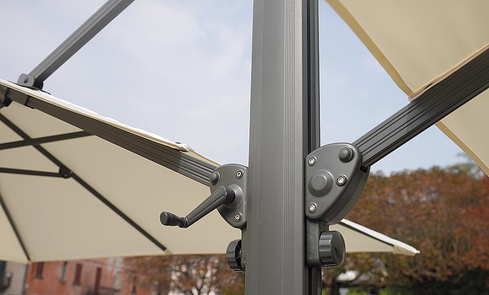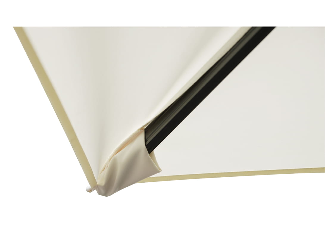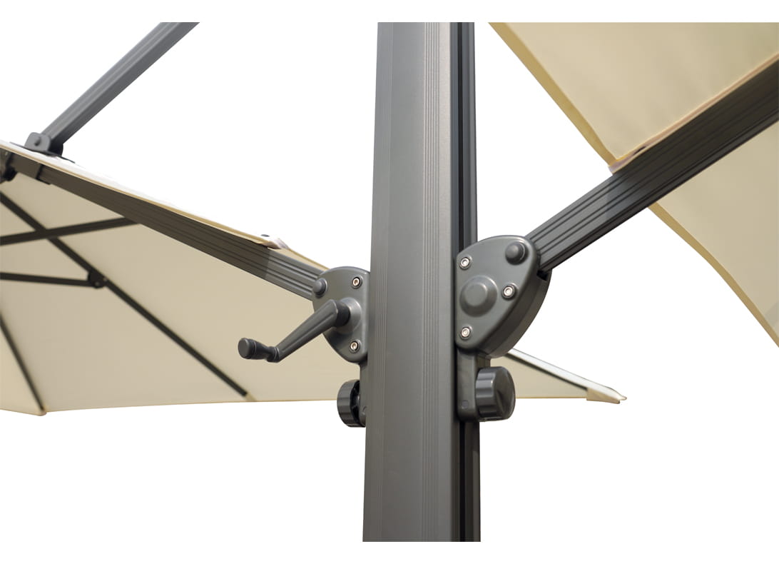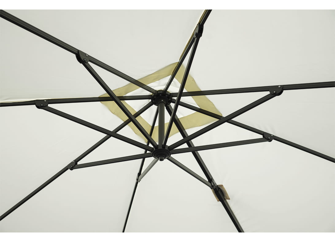 Aluminiowa konstrukcja w kolorze antracytowym cechuje się odpornością na czynniki zewnętrzne i nadaje parasolowi elegancki, minimalistyczny charakter. Poszycie w kolorze ecru nie tylko chroni przed promieniami słonecznymi, ale także optycznie rozjaśnia przestrzeń wypoczynkową.