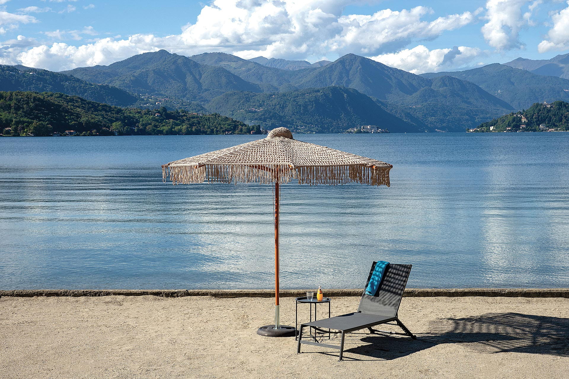 Makramowe, ażurowe poszycie z ozdobnymi frędzlami subtelnie rozprasza światło słoneczne, tworząc miękki cień i wyjątkowy, dekoracyjny efekt.