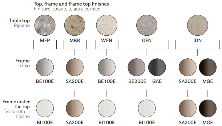 Stół dostępny jest w poniższych wykończeniach blatu i podstawy. Każdy blat występuje z dedykowaną podstawą. W celu wyboru wariantu prosimy o kontakt telefoniczny lub mailowy.